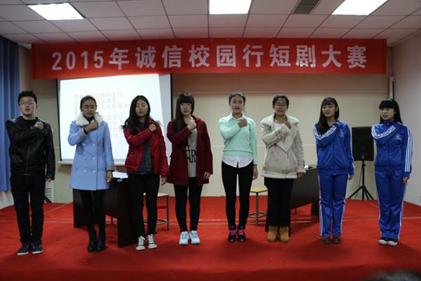 下午2点整,比赛准时开始。虽然场外阴雨霏霏,冷风阵阵,但是丝毫不影响参赛演员和工作人员的热情。场内座无虚席,比赛井然有序的进行,演员们的表演也精彩异常。同学们通过与大学生息息相关的小事,从不同方面诠释了诚信的主题,向观众普及了大学生资助政策,大家表情到位,服装道具齐全,背景音乐渲染恰到好处。一场穿越,逗得观众哄堂大笑;一段感人肺腑的内心独白,听得大家眼泛泪光。比赛期间,药学院十佳歌手、药学院舞蹈队还为大家带来了精彩的串场节目的表演,博得阵阵掌声。最终,公共管理学院《我和郑大有个约定》、信息管理学院《贷款风波》和机械工程学院《谁的错》分别获得第一、二、三名,成功入围决赛。最后,音乐学院团委书记韩宁老师针对此次比赛作出了全面而专业的点评,对同学们的表演以及本次比赛给予了极高的评价。