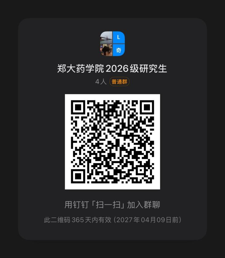请所有2026年拟录取研究生务必加入郑州大学药学院钉钉群,后续相关工作将通过钉钉群向大家发送通知,如有疑问请联系卢老师,联系电话:0371-67781902。