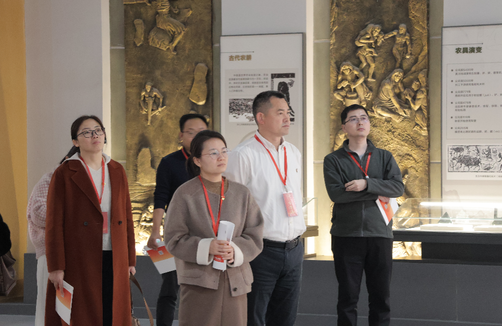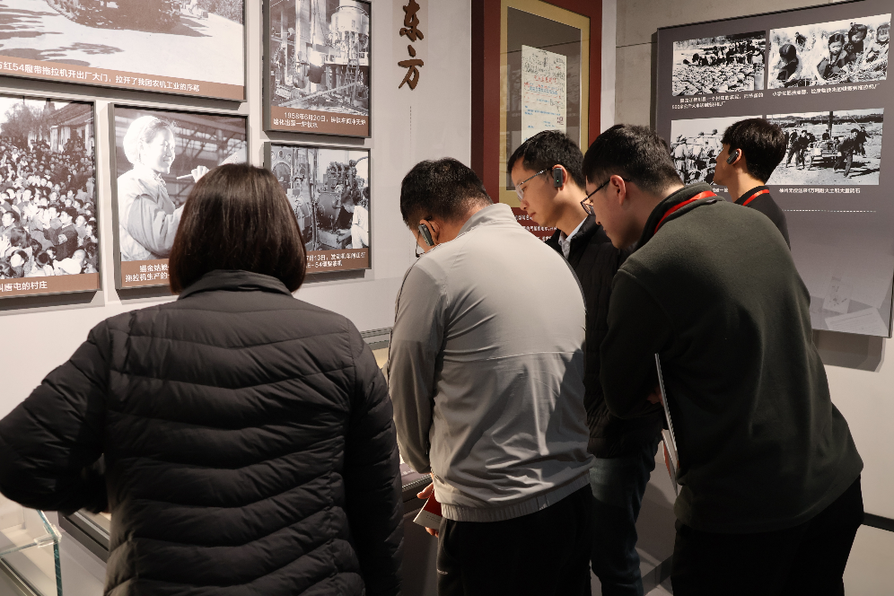 下午,师生一行参观东方红农耕博物馆,探寻中国农业机械化的奋斗足迹。作为国内首个现代农耕主题博物馆,馆内陈列着从传统犁耙到东方红系列拖拉机等一系列珍贵实物,系统展现了我国农耕技术从“人畜力”到“机械化”的跨越式发展。在东方红拖拉机研发历程展区,老专家“白手起家、自主创新”的感人故事让在场师生深受震撼;在毛主席“关于拖拉机厂建设规划”的批示手稿前,师生们驻足端详,深刻感受到国家决策的历史厚重与时代力量。