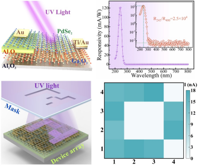 相关研究人员报道了在合成的Sn掺杂Ga2O3薄膜上,通过直接沉积二维PdSe2薄膜来构建PdSe2/Ga2O3范德华异质结光电探测器,其具有高灵敏日盲紫外光谱探测能力。该探测器展现出自驱动工作特性,在零偏压下响应度和比探测率高达123.5 mA/W和1.63×1013Jones,同时具有0.15/2.3 ms的快响应速度。此外,基于PdSe2/Ga2O3异质结集成阵列器件展现出优异的日盲紫外成像能力。该研究为实现高灵敏日盲紫外探测和成像提供了一条可行的策略。