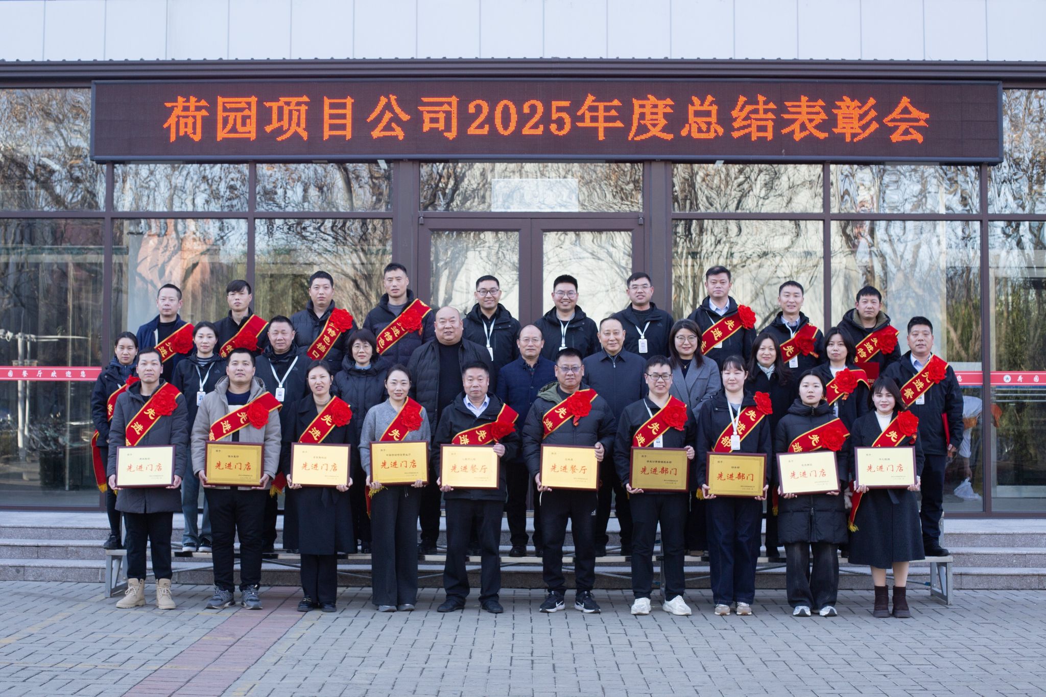 副总经理马士进宣布了《关于表彰2025年度先进集体和先进个人的决定》。与会领导为先进集体和先进个人代表颁发了奖牌及荣誉证书。先进部门代表杜俊涛、先进门店代表任莉霞、餐厅先进代表刘爱杰、优秀管理员代表谢娣分别发言。